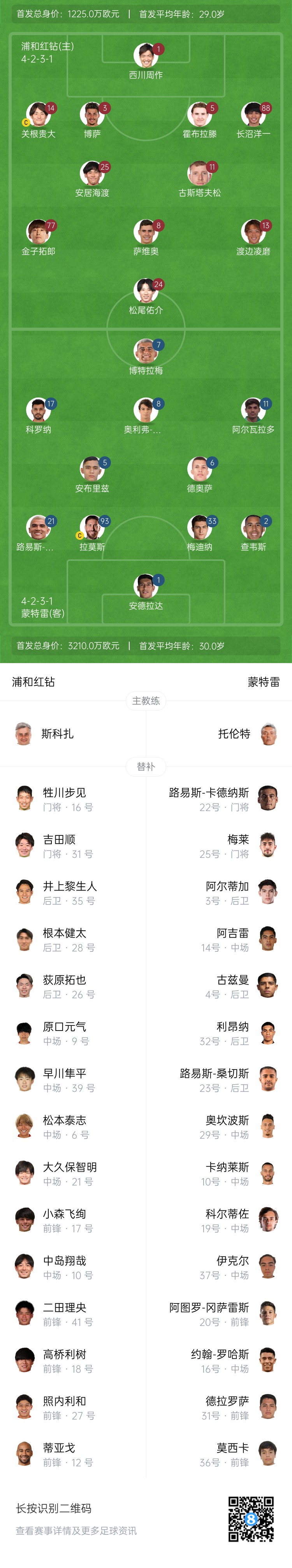 浦和红钻后备 :16-牲川步见、31-吉田顺、26-荻原拓也、28-根本健太、35-井上黎生人、6-松本泰志、9-原口元气、10-中岛翔哉、21-大久保智明、39-早川隼平、12-蒂亚戈、17-小森飞绚、18-高桥利树、27-照内利和、41-二田理央