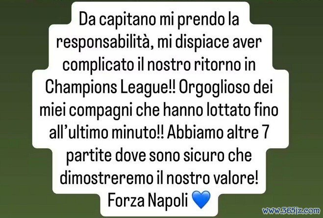 直播吧9月20日讯 那不勒斯领队 迪洛伦佐在社媒发文,为自己在欧冠赛事 中的驱逐 道歉。